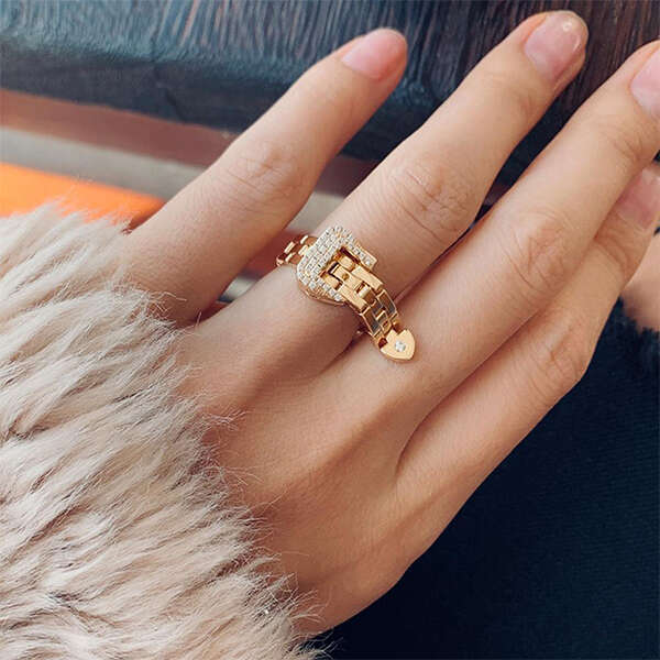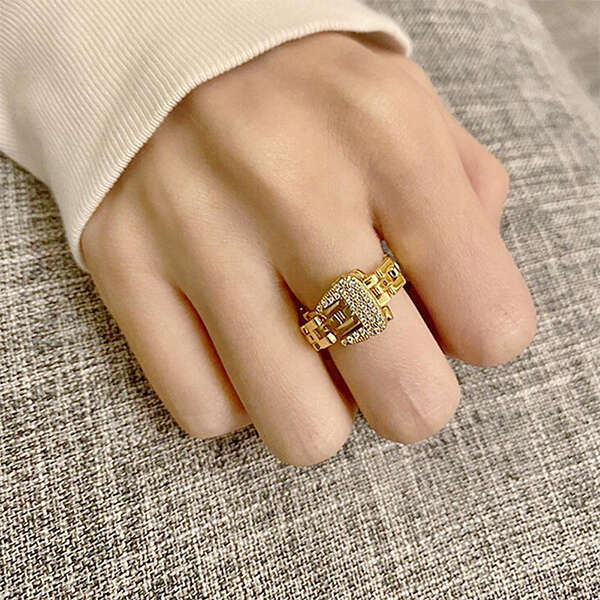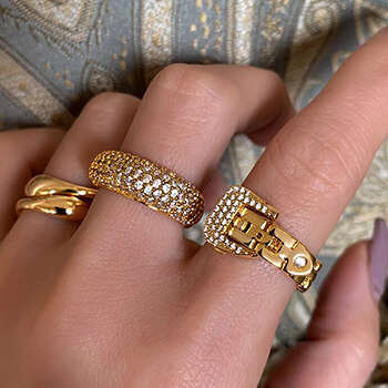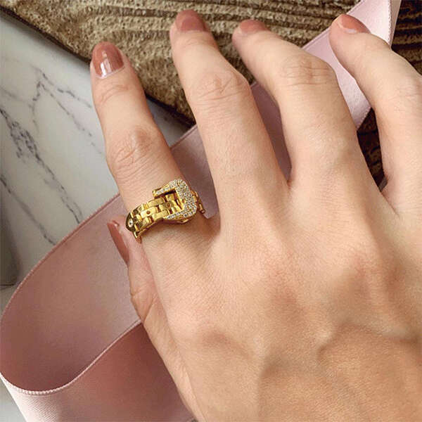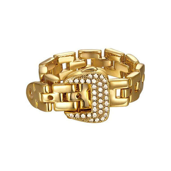 Elegantiškas diržo formos žiedas su sagtimi ir cirkoniais. Palepinkite save nuostabiu blizgesiu ir unikaliu dizainu ir pademonstruokite moderniausius papuošalus ant rankų.