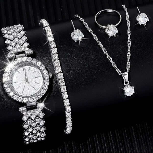 1 rankinis laikrodis, 1 karoliai, 1 žiedas, 1 pora auskarų, 1 apyrankė