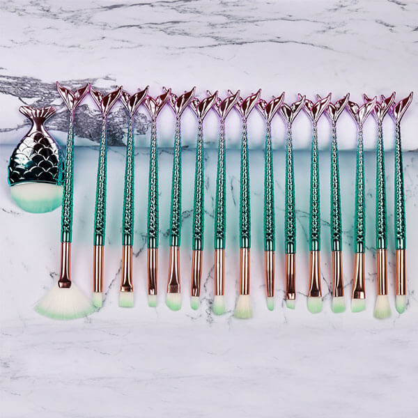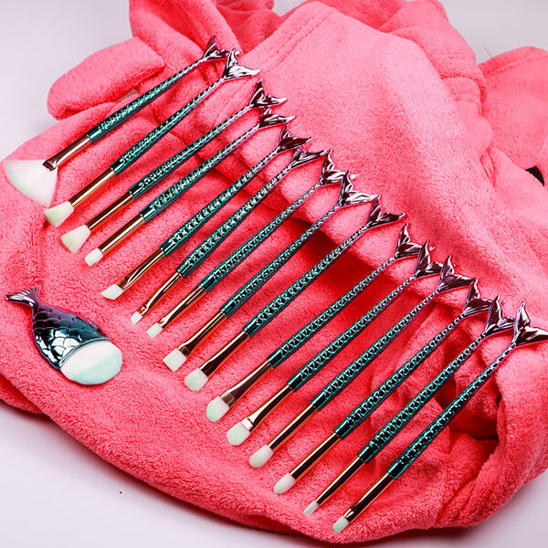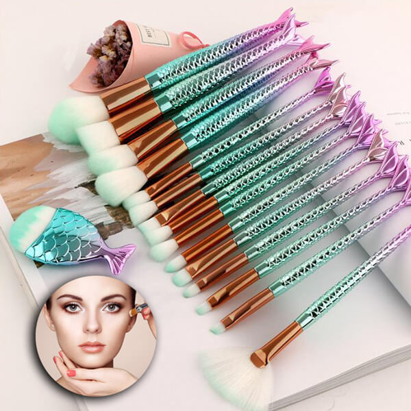 Įspūdingas unikalių makiažo šepetėlių rinkinys prašmatniame spalvingos undinės uodegos dėkle. Minkštas, hipoalergiškas ir švelnus.